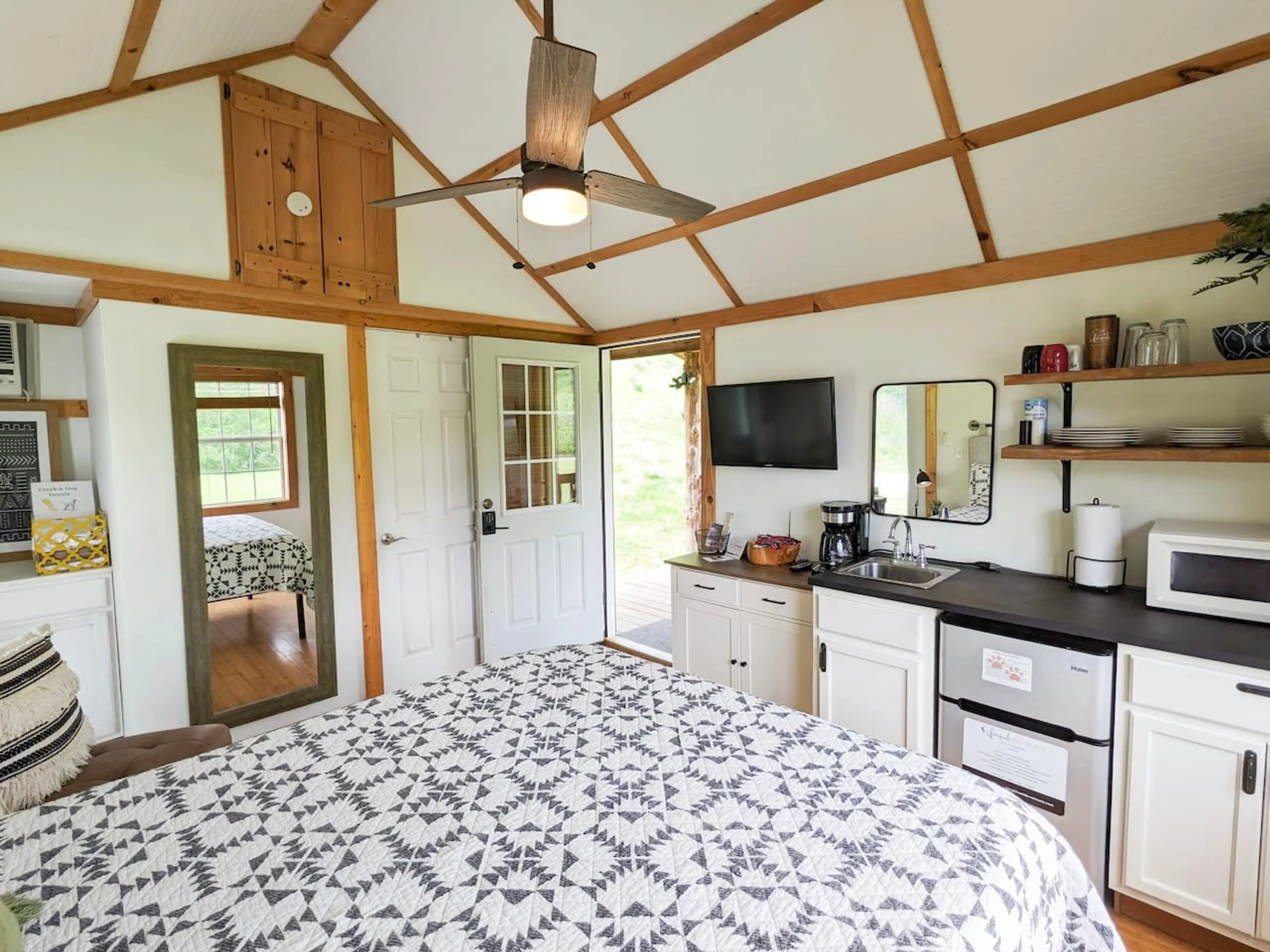The Cabin-ette is an itty bitty 350 sq ft creek-side Cabin in Mountain View, AR- perfect for one or two people. With all the basics you need for an Ozark getaway, you'll want to snuggle up with the one you love in this quaint tiny cabin. The cabin-ette has one queen bed, kitchenette with the basic...