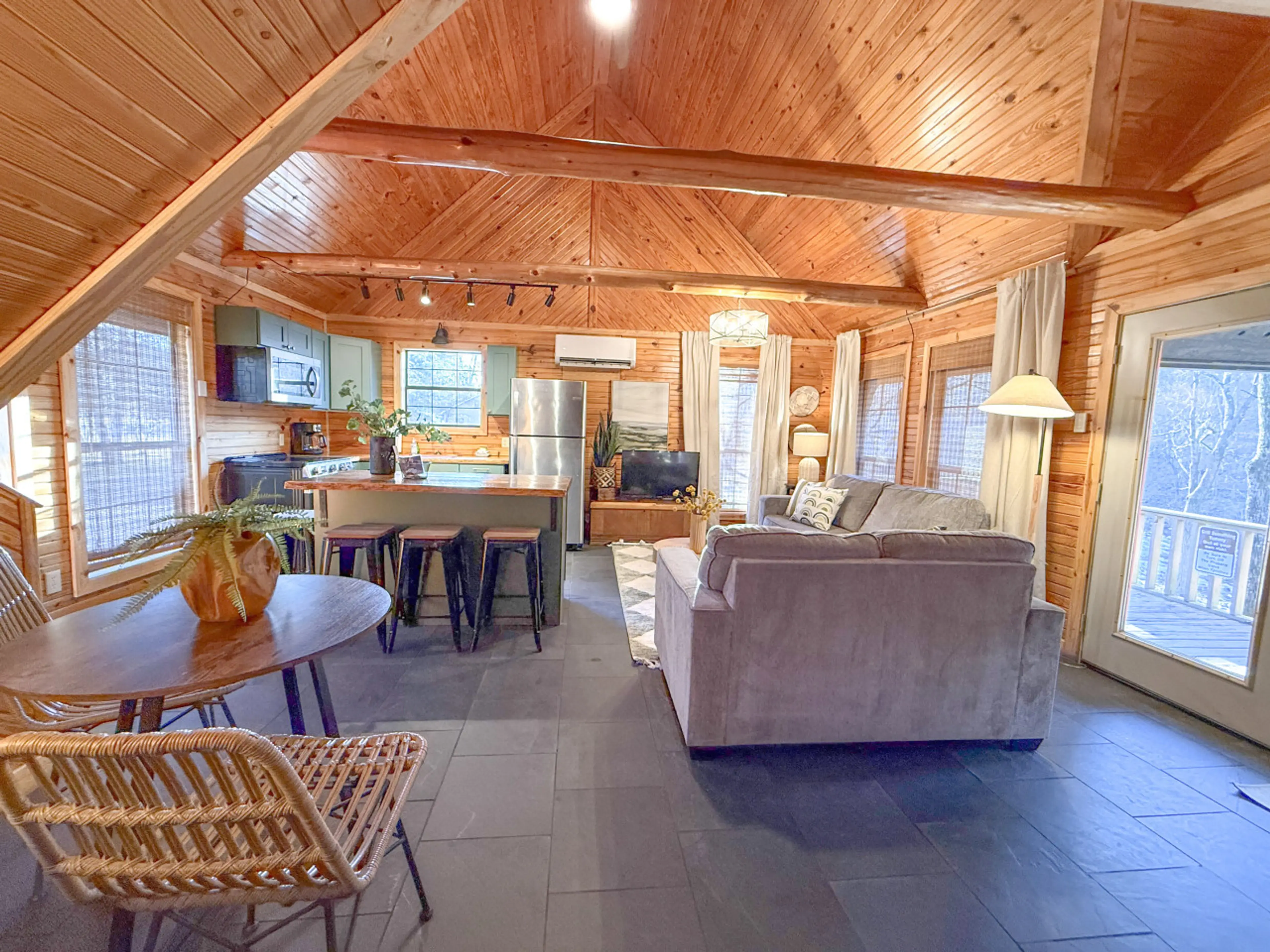 Lounge on the covered porch with a beverage and listen to the sounds of Livingston Creek. This cabin is right on the banks of the creek and just over a mile from fishing on the White River. With a queen bed in the downstairs bedroom and two twins/one full bed in the upstairs loft, it's a perfect g...